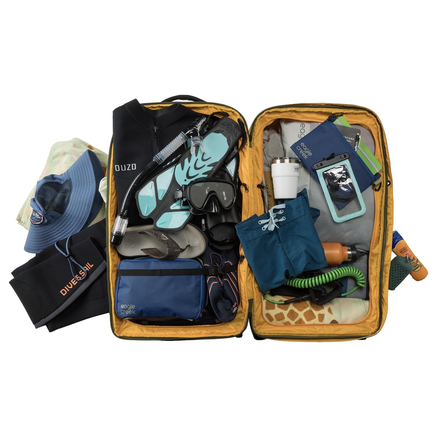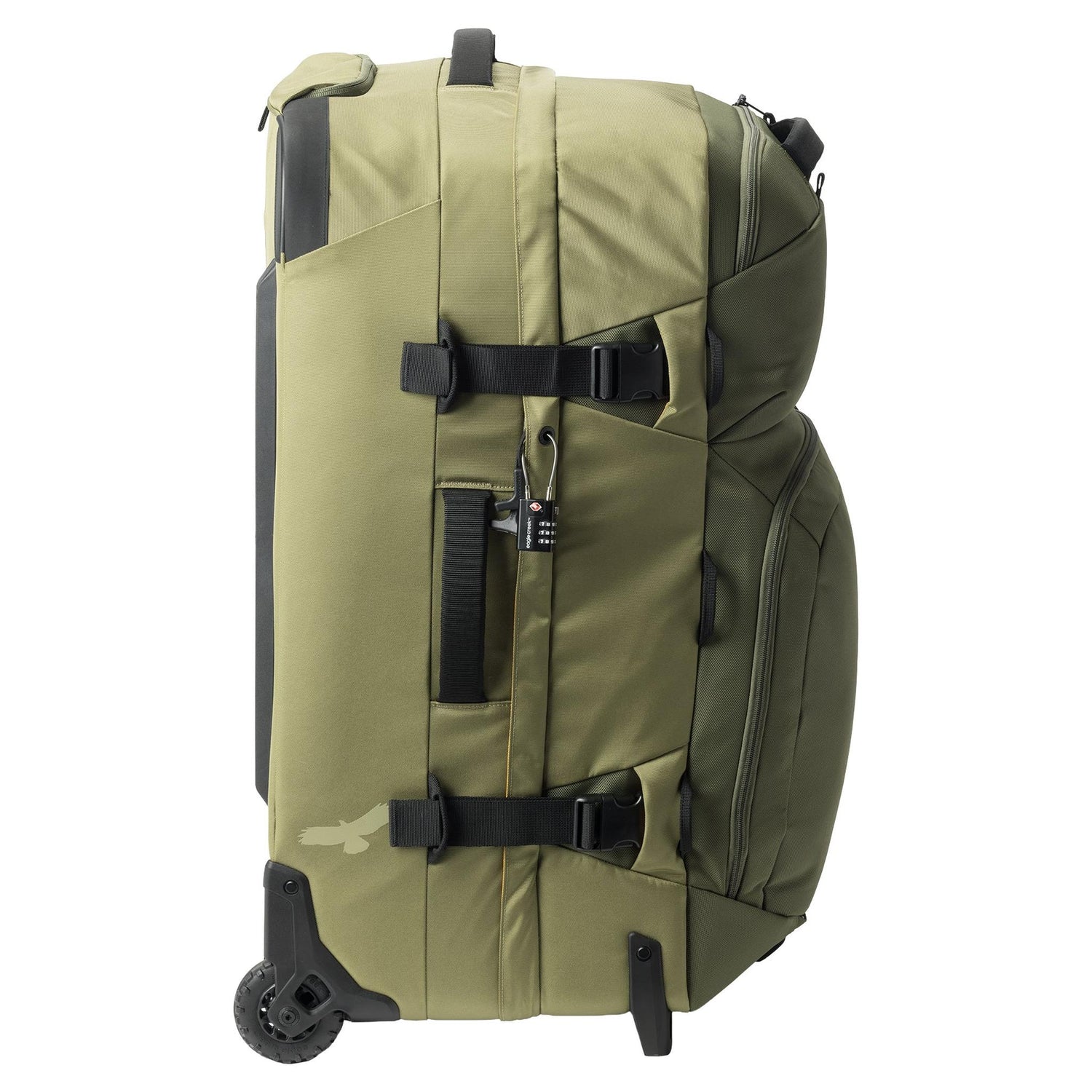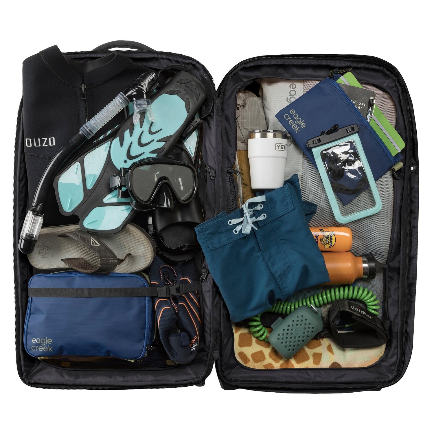 The Eagle Creek ORV Trunk 30 Inch combines compact design with rugged durability. Built from sustainable materials with a protective silicone liner, it features a clamshell opening, adaptive compartment dividers, and dual compression straps for efficient packing. Heavy-duty wheels, reinforced corners, and lockable zippers ensure reliable protection. Includes a cargo net, grab handles, lash points, tow strap, and integrated tracker pocket for complete travel security.