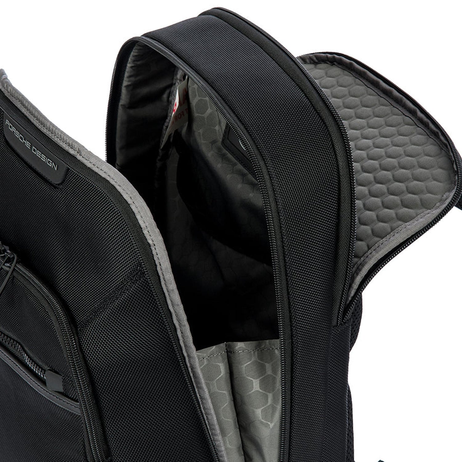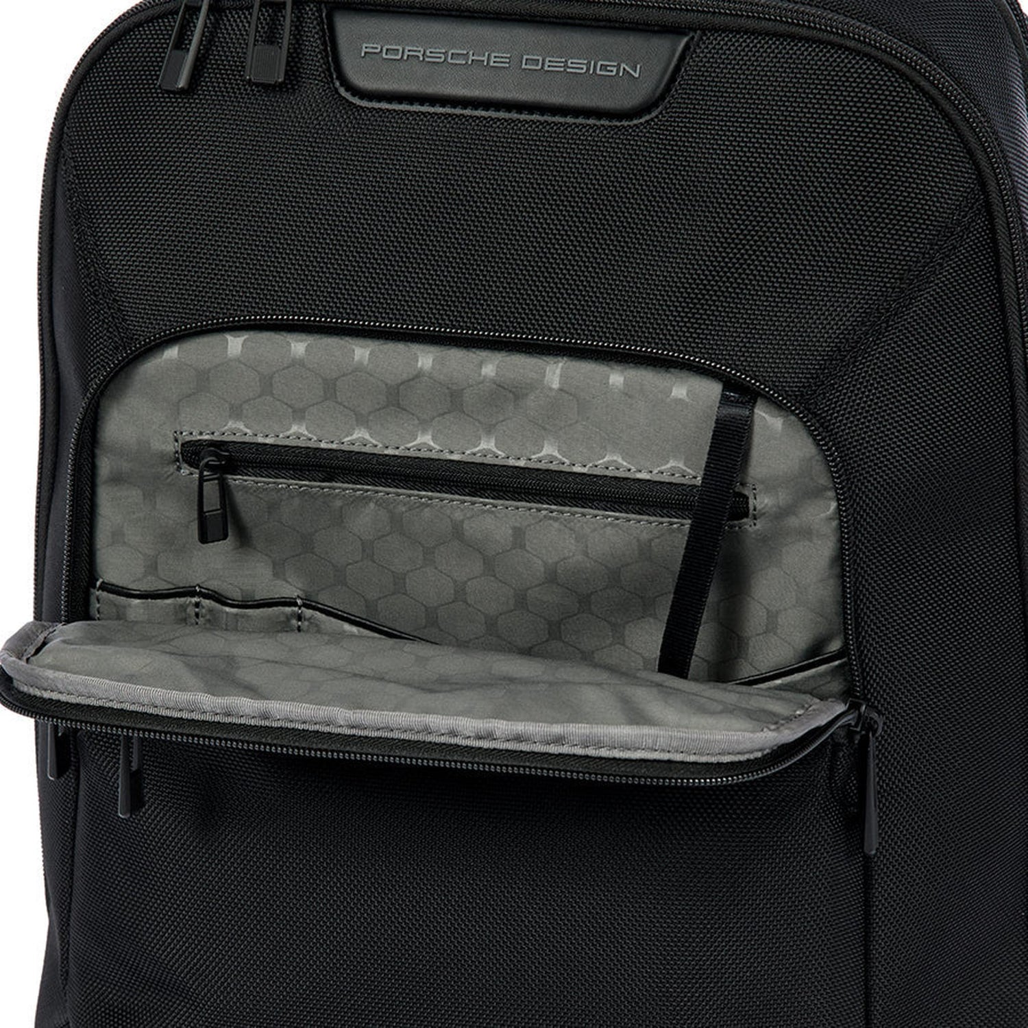 The Porsche Design Roadster Nylon Evo Backpack XS is designed for high demanding professionals. Made to meet the commuters needs, the recycled nylon is water-repellent, durable and lightweight. Your 15" laptop can find a secure spot in an integrated laptop compartment found in the roomy main compartment. The front compartment with a business organizer holds all important small items. Valuables such as keys can be stored and protected in the pocket hidden in the trolley sleeve. The backside and the shoulder straps have soft padding.