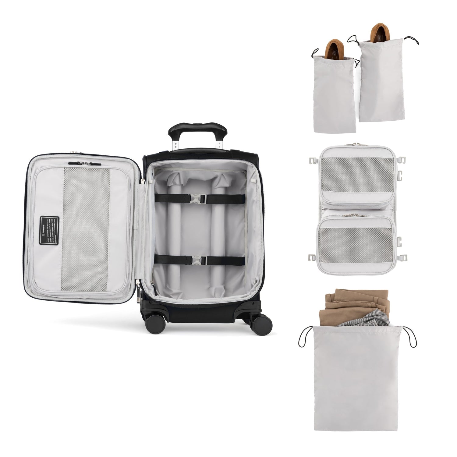 - Includes compression packing cube system, two removable shoe bags and a removable laundry bag
