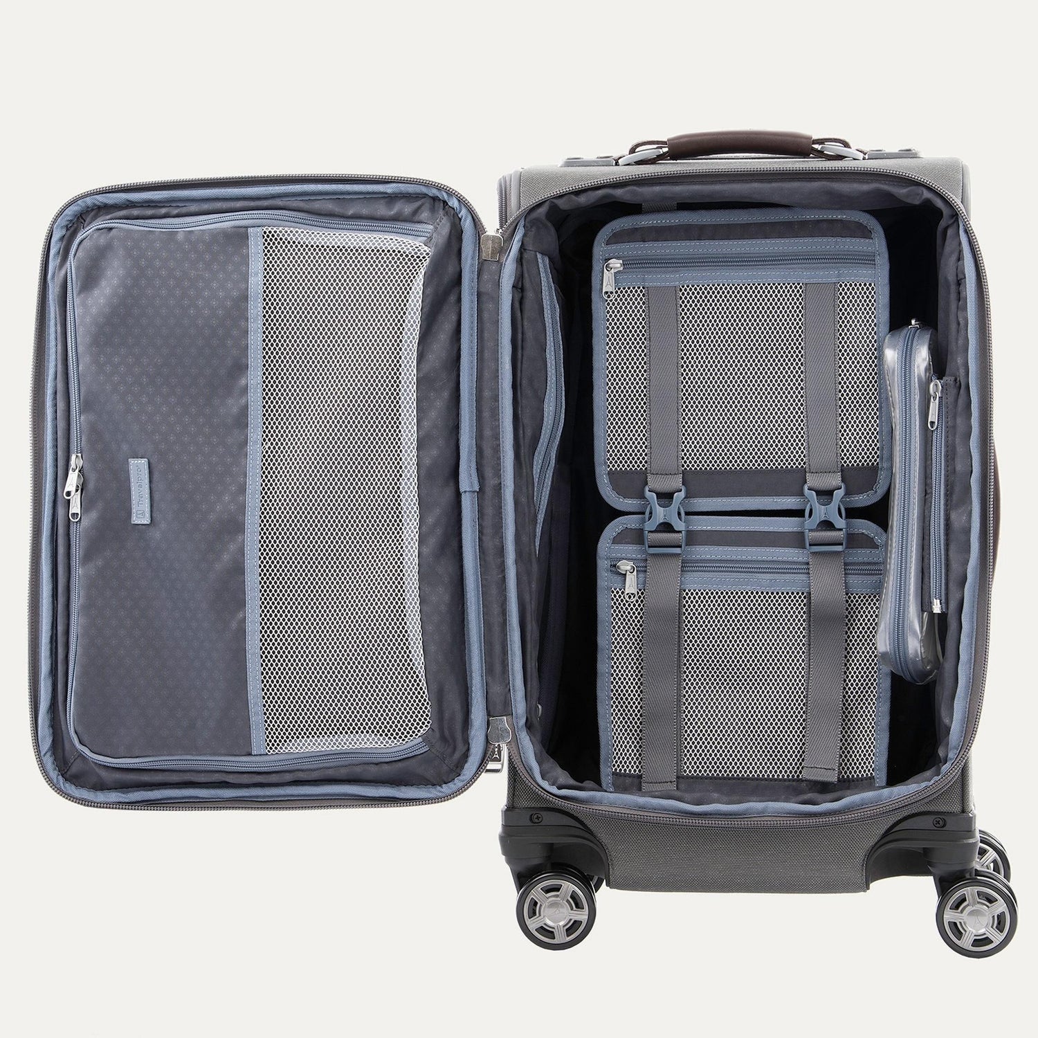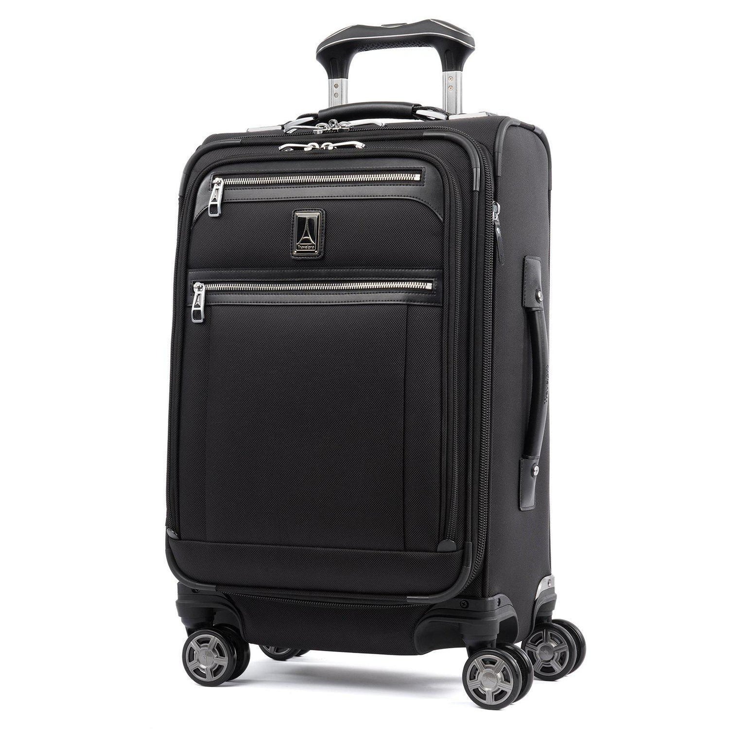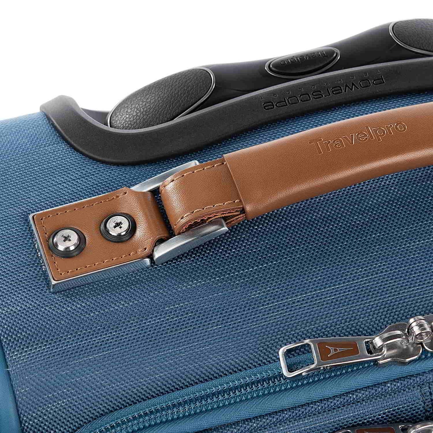 - Travelpro Platinum Elite lets you maximize your carry-on in sophisticated style, featuring premium fabrics, genuine leather, chrome zippers, and a tip-resistant expansion that offers up to 2” more packing capacity