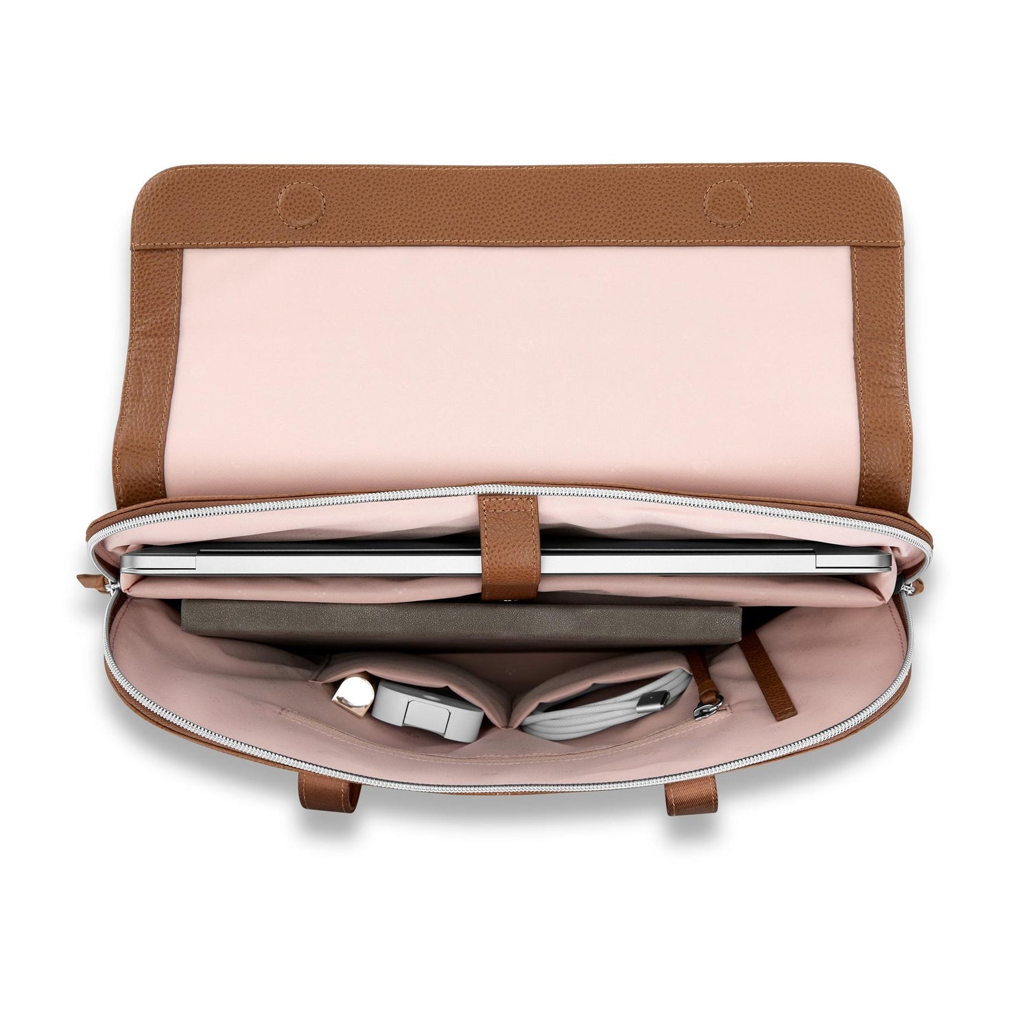 The Convertible Leather Brief features a padded laptop sleeve, interior organization with a zippered pocket and sleeves and a discreet StackIt™ strap. The zipper and magnetic closures on the main compartment offer versatility and security.