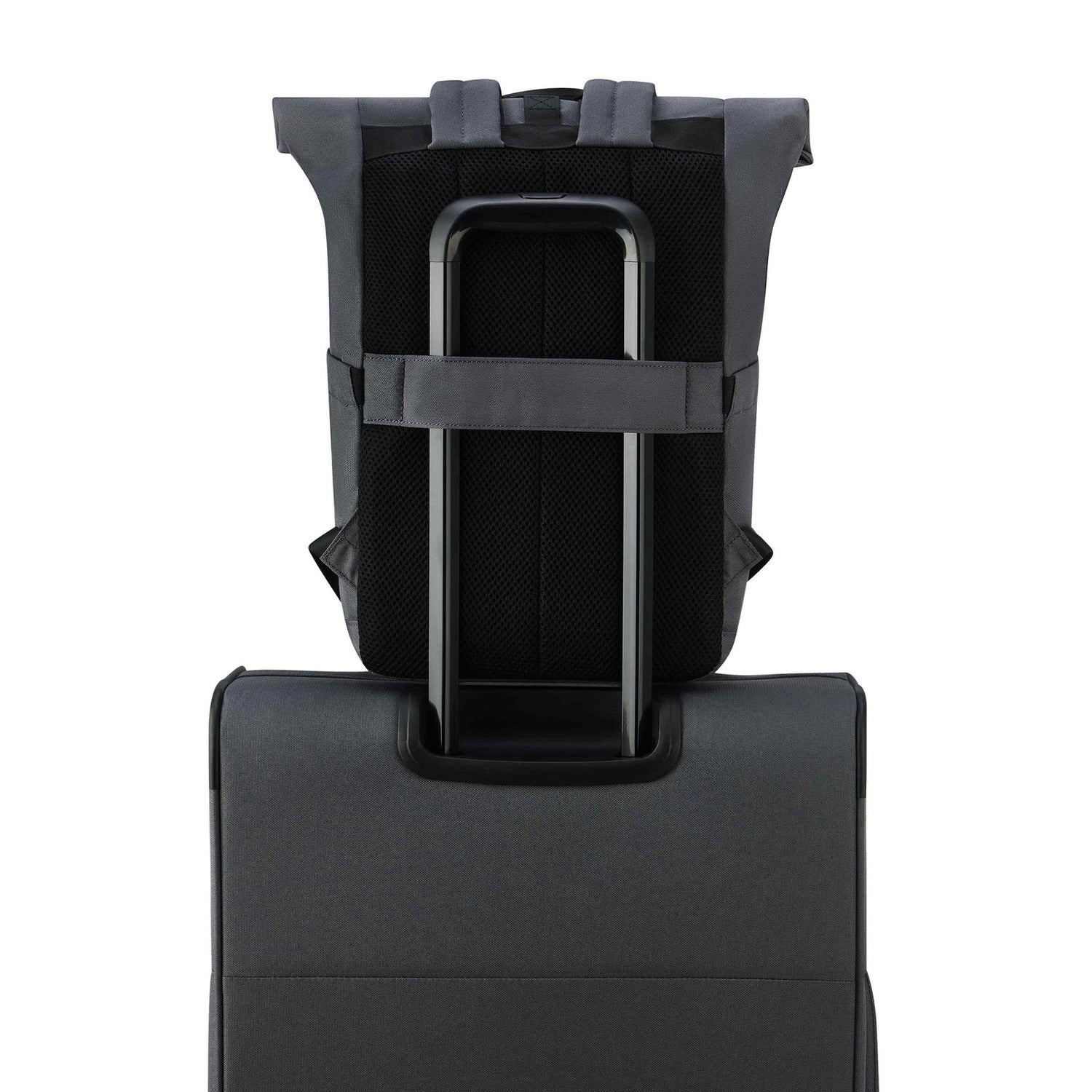 - Smart band, allows you to effortlessly slide the backpack over the trolley system of your rolling luggage